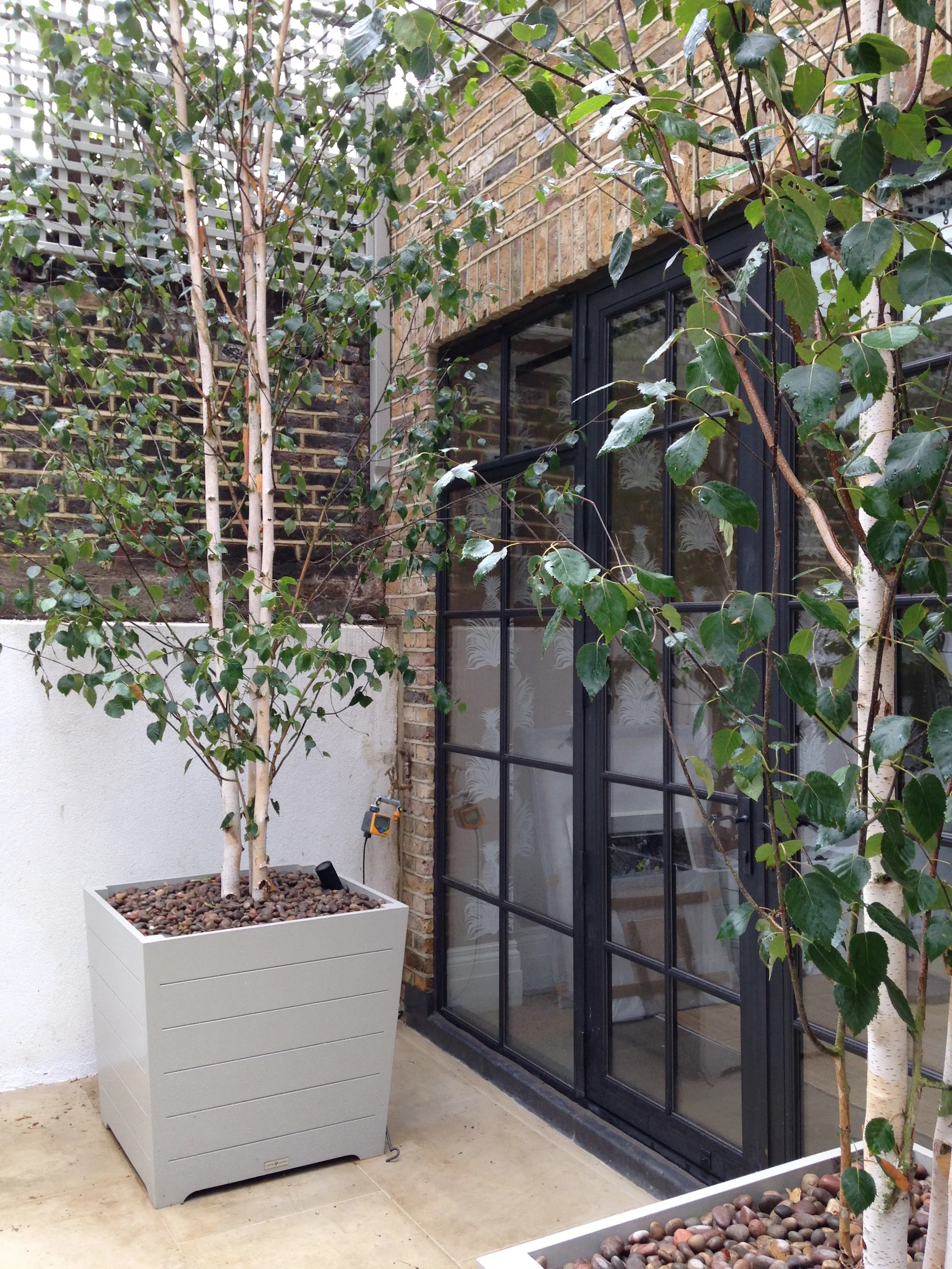 Two beautiful multistem Birch trees, in chunky wooden planters painted to match the custom-built trellis, flanked the doorway to the house.