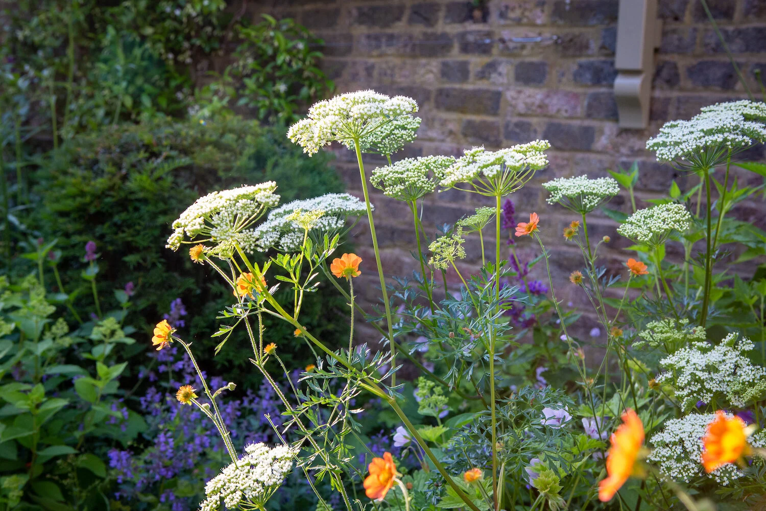 Our clients wished to transform their rectangular garden to include statement Yorkstone steps directly accessed from their lower ground floor kitchen. Decorative brickwork links the two levels of the garden including the vertical walls visible from their dining table. Raised beds of woven willow, Italian terracotta pots, metal furniture and painted trelliswork are complimented by a vibrant planting scheme, with Taxus baccata ‘beehives’ providing evergreen structure.